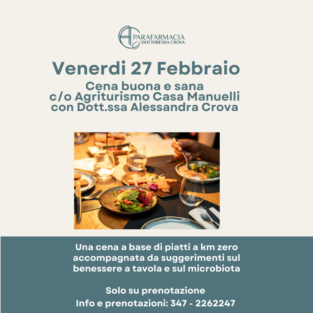 La Parafarmacia Crova è lieta di invitare la propria clientela a un appuntamento dedicato alla salute e alla cultura del buon cibo. Venerdì 27 febbraio, presso l’Agriturismo Casa Manuelli a San Michele (Alessandria), si terrà una serata conviviale finalizzata a coniugare il piacere della tavola con l’approfondimento scientifico sui temi della nutrizione.