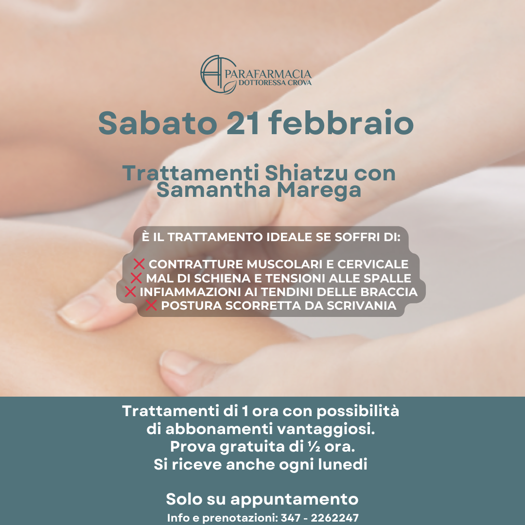 La Parafarmacia Dottoressa Crova è lieta di presentarvi una giornata dedicata al benessere olistico attraverso lo Shiatsu, antica disciplina giapponese che utilizza pressioni mirate e manipolazioni sui meridiani energetici per ristabilire l’equilibrio corporeo, ridurre lo stress e attivare i naturali processi di autoguarigione.